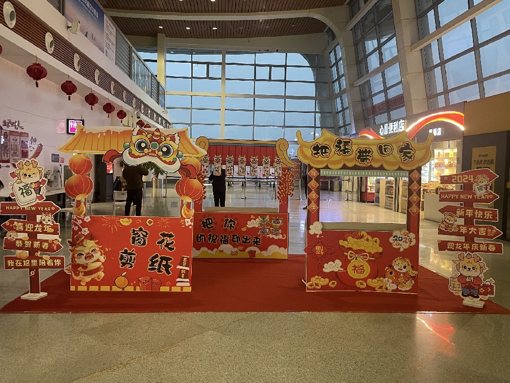 2024-01-31 09:59:04萬象更新,祥龍賀歲,四處洋溢著漸濃的年味。三明機場為讓進出港旅客沉浸式感受福建傳統(tǒng)民俗文化結(jié)合本地特色融合“福”文化,將候機樓裝扮一新。以喜慶、熱烈的節(jié)日氛圍裝點“家人”們的團圓之旅!甲辰龍年將至,從踏入候機樓的那一刻起,目之所及均是“中國紅”。近期,機場候機樓內(nèi)新春布置陸續(xù)亮相,